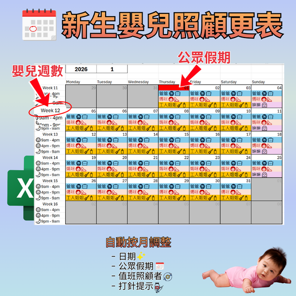 【Excel範本完成版本下載】月曆 及 員工更期表 - 自動按月調整 | 公眾假期顯示