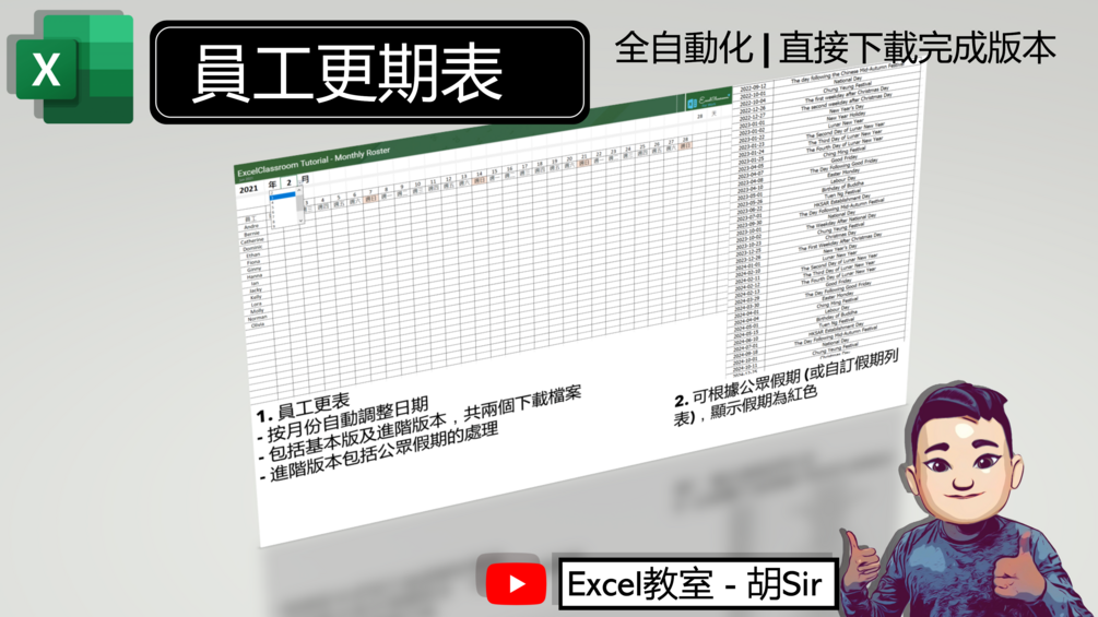 【Excel範本完成版本下載】月曆 及 員工更期表 - 自動按月調整 | 公眾假期顯示
